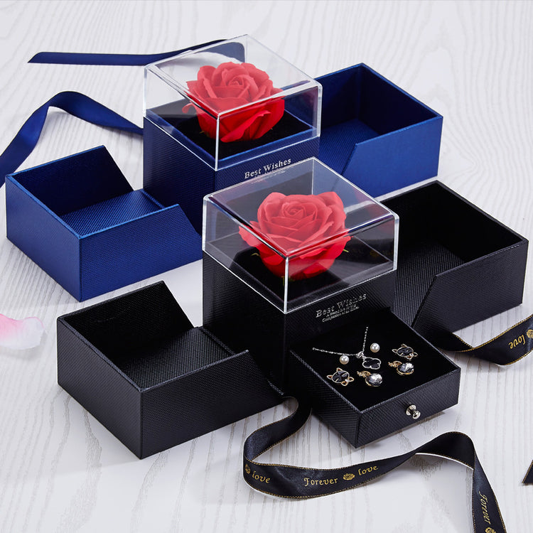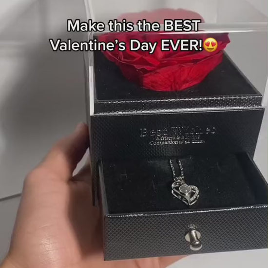 Surprise her with a Valentine's treasure: a timeless preserved rose paired with a keepsake necklace in a chic leather-style box. Make moments unforgettable with sustainable luxury.